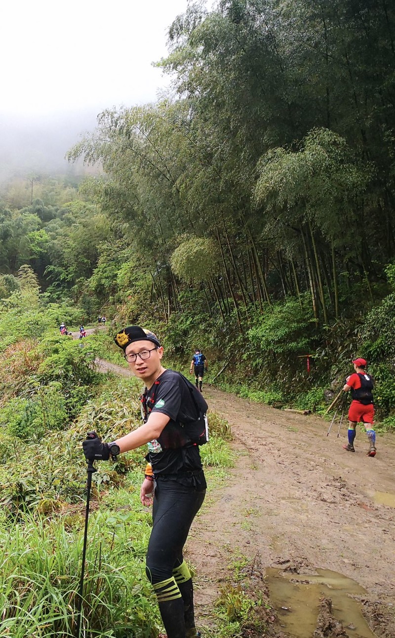 原始的土路,混合上雨水,早已是泥泞不堪,再加上前面N多选手经过之后,已经被踩的面目全非。之后的一路便始终与泥水为伴,不离不弃!虽然也带了帽子,但山里的雾气,时大时小的降雨,和呼出的雾气,让我的眼镜始终处于一种朦朦胧胧的状态。