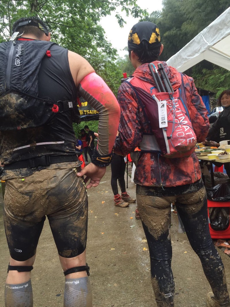 我也是在这个地方摔了一跤,老蔡也是,没能幸免。在这之前的一个地方,也是因为脚下一滑,左手下意识的去抓了一把路边的树枝,摔没摔到,但左手虎口不小心被划了两道血口,浑身湿透也没有什么东西可以处理,只好把已经湿透的头巾缠在左手虎口上,大拇指紧压着伤口,不让血继续流。这样,在CP2之前的路上,左手基本上就废了,一直到CP2,找医务人员消毒,贴上创可贴,再带上手套,才稍有缓解。