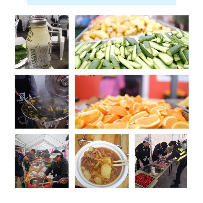 这次的补给确实没得说的,每个CP点都是长长的一排,每次进站,要么就是2碗牛肉土豆汤,要么就是3碗榨菜粥,再加上一把火腿、一把杏仁、一把葡萄干、芝士、香蕉、圣女果、小黄瓜... 在CP2的时候,我守着一大盘切好的橙子,大概吃了1/3盘。终点完赛休息区又是大型自助餐现场,完赛小啤酒虽然考虑到还要开车不能喝,还是带走一瓶回家收藏!