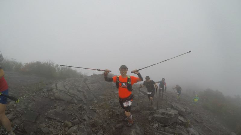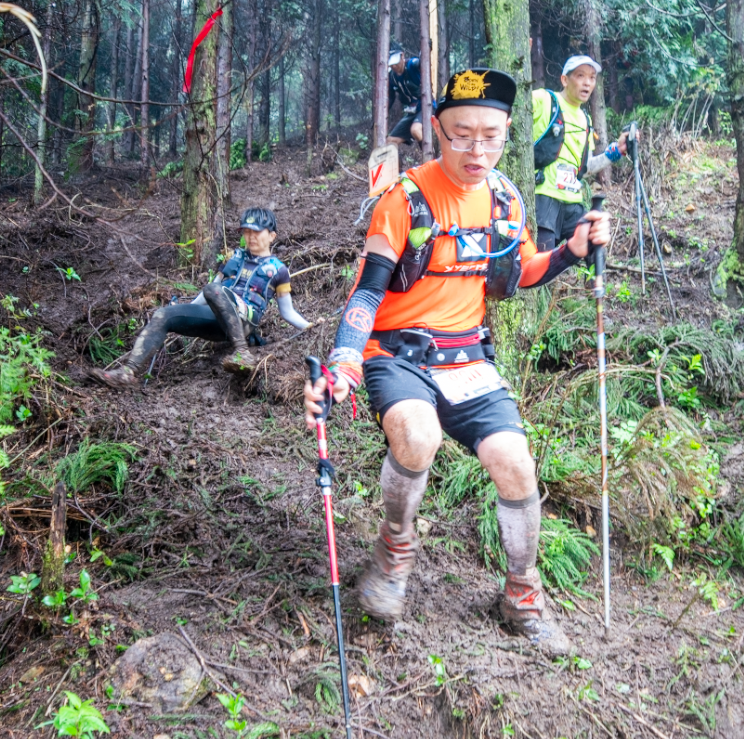 5:17CP1龙潭岙村出站后依然是小跑,1km左右的水泥路后开始爬升,一段缓坡小跑加快走后,1100米爬升的陡坡便来到了脚下,加上下雨,慢慢出现了堵车现象?不过这时才刚开始,大家还有一句没一句的交着……偶尔有人从后面借道,超车过去……约莫过了半个多小时,勇哥也有点安耐不住,超车向前而去,而我还在后面慢悠悠的跟着大部队,偶尔有人在路边休息,也会超过一两个人。