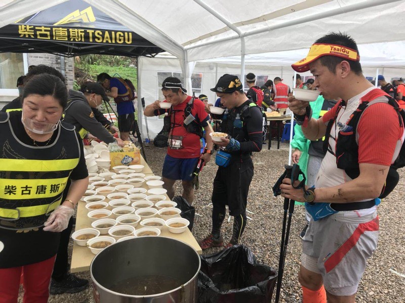 接下来的4km,下坡、上坡,难度不大,和大大一前一后到达CP5跑马平打卡点。喝了两碗姜汤,吃了点干果和圣女果,装满水,14:48出站。由于和大大节奏不同,他擅长上坡,我擅长下坡,而本段以下坡为主,所以两人在出站后不久就分开了。双帐在手,哪都敢走,面对泥泞的道路,不管鞋子是否弄脏,只要好下脚,都会踩……1000多米的下降不是盖的,最后的一个陡下坡两腿开始发软,手臂也开始微微酸疼,后悔平时上肢力量训练没跟上……17:10分左右,到达换装点CP6黄家寮,强装检查通过后,去河边冲洗了下鞋和小腿,洗了个脸,手表冲电,换装,吃了2碗肉丝面+一些圣女果和干果,打开手机想看看勇哥和其他人的状况,没有信号,只能作罢。于是趁着天还没全部黑下来,18:00出头,踏上下一半的征程,比赛会关门时间提前2小时出门,此时完赛信心倍增。