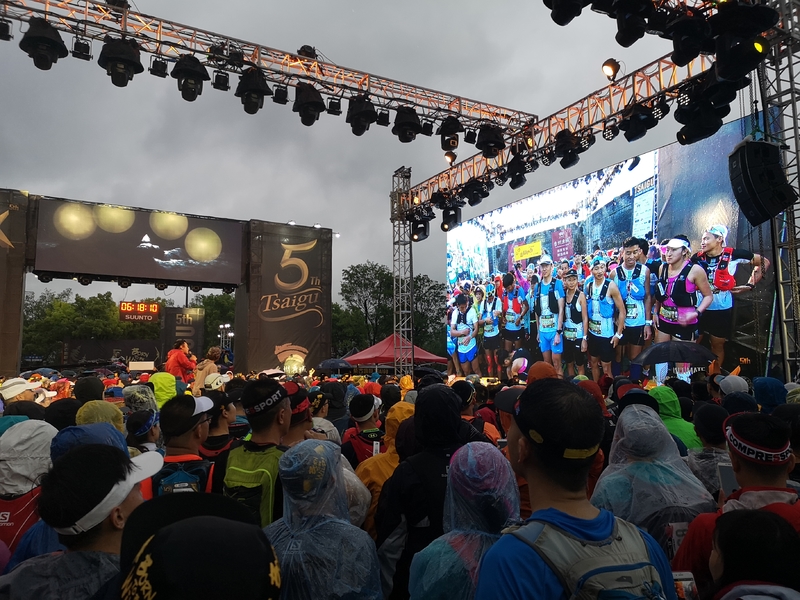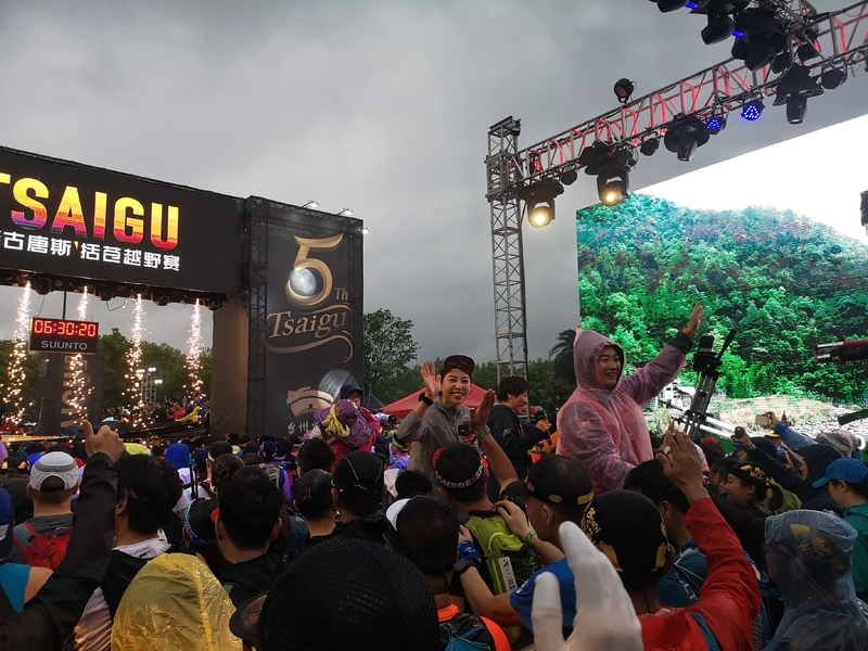 出发仪式开始,雨停了,这是今天的第二场出发仪式,凌晨4点钟110公里组大神已经先行出发,早上6:30出发的是80和50公里组的选手,柴古的出发仪式气氛很嗨,象置身于一场火爆演唱会现场。当柴古赛事主题曲响起时,全场气氛热烈非凡,虽然主题曲是最新发布的,但选手们显然已经单曲无限循环过,全场合唱,动感的旋律、激情的画面极大地唤起大家的热情和斗志,在倒计时声中信心满满地出发了。
