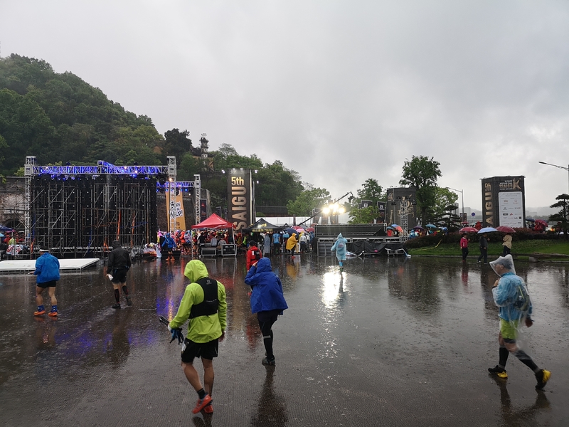 周六早上5:20,酒店专车送到位于兴善门广场的赛事起点。恼人的雨,还是下个不停,起点场面冷清了许多,选手们都在躲雨,等待着出发时刻的到来。