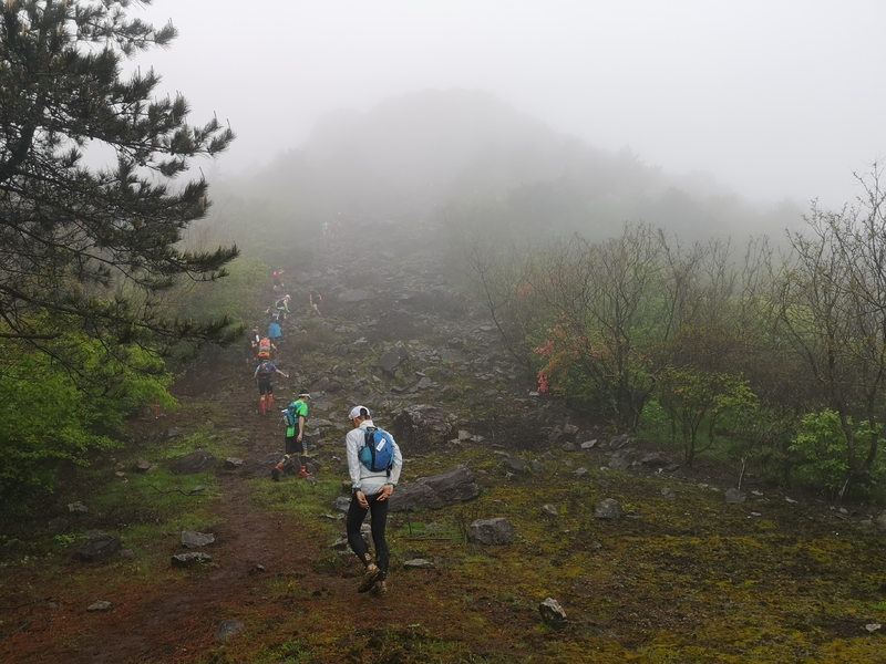 下了江南古长城后,过江后在公路上奔跑,一路平路到了龙潭岙CP1,用时1小时8分,这一段以跑马的方式完成,跑的挺爽。简单补给后快速出站,开始第一个总计1115米的大爬升,雨后山路已变得很湿滑,先出发的110KM组几百双脚踏过后,这泥泞路已经不象路了,本来能跑的山路也只能小心走,好在上坡,不容易摔。爬升到了山顶,眼前豁然开朗,只是天气不理想,层峦叠嶂的括苍美景隐藏在云雾中,也好,可以安心爬坡了。