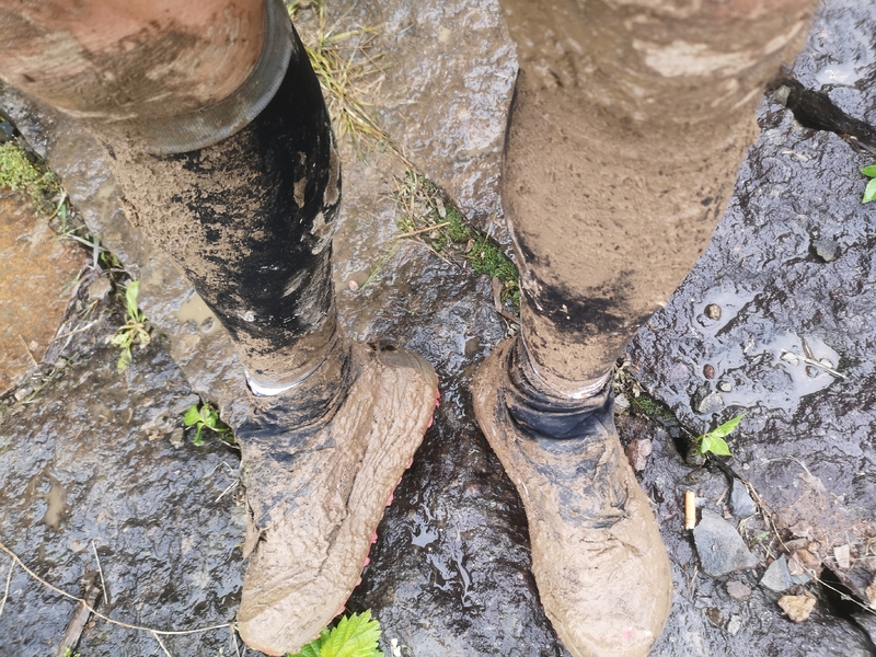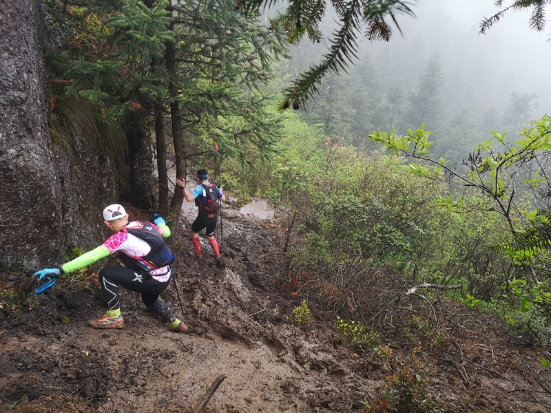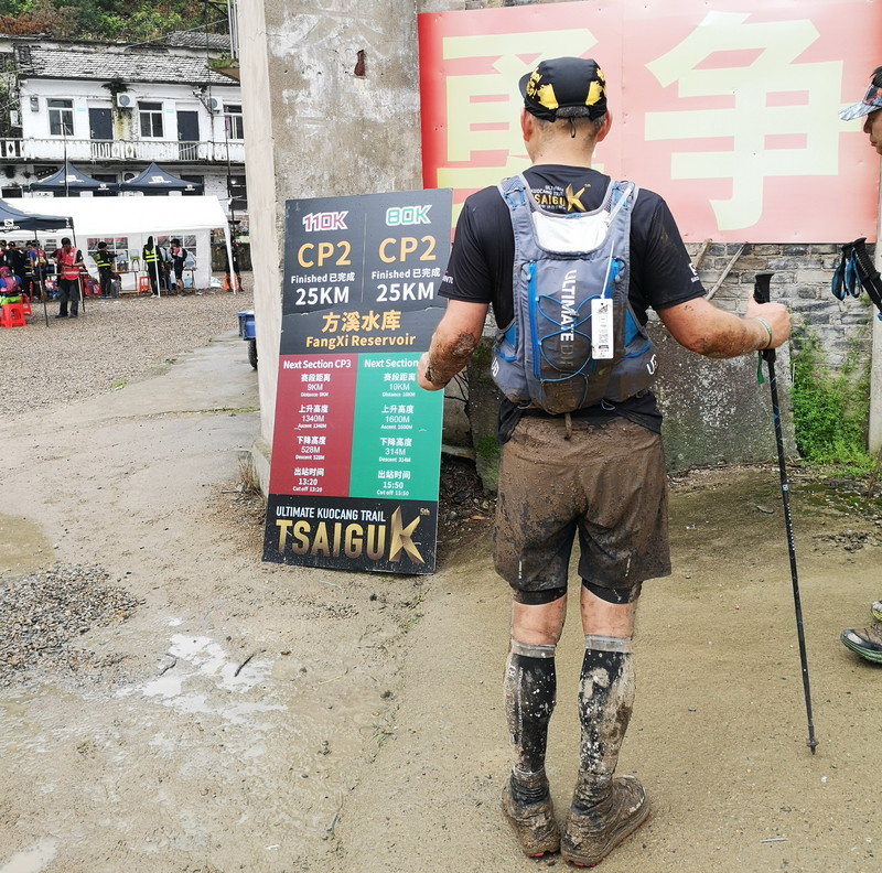 到了SP1仙桃岩,志愿者热情地为大家加水,并嘱咐大家下山要小心,下山泥路已被踩烂,非常难走,果然,这海拨下降近千米的超长下坡中,自己在泥浆路上吃尽苦头,不知道摔了多少跤,碳杖摔断了一根,手掌也刮破了,带了一身的污泥很狼狈地赶到了方溪水库CP2,比关门时间提前了39分钟,此时感觉体力已消耗大半。