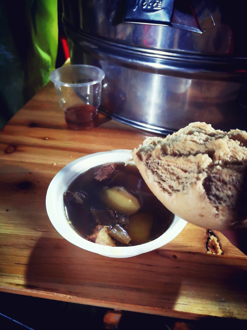CP3出发不敢耽误时间,但在一小段盘山公路上差点跑错,好在有其他跑友告知,要不然铁定退赛了。到达CP4之后,简单吃了几口补了可乐就匆忙上路。可是完全低估了CP4-CP5这9公里的路程。预想着2个半小时跑完,为CP6赶点时间,可没想到足足3个多小时才跑完。好在那里有吃到了这辈子最好吃的牛肉汤,眼圈泛红的连吃三碗。