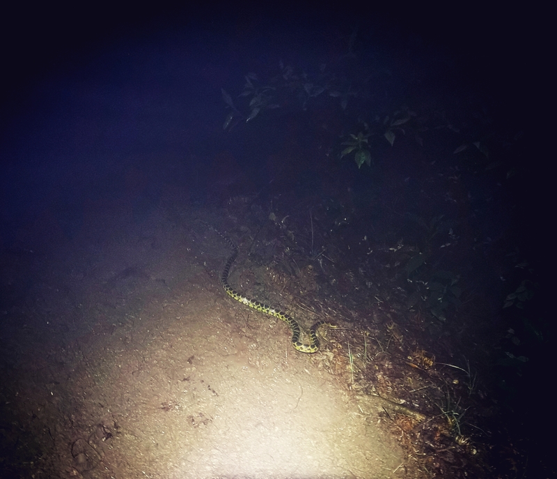 距离出站几米的地方,竟然遇到了蛇,对于这种生物我一直心声恐惧。好在对视后,它离我而去。接下来的路程我格外小心,生怕再碰到。除此之外,最后的一段路程,由于缺觉,加上雾气太大,头灯没来得及换电池,差点直接走到路旁的深沟里。现在想想,还有些后怕。