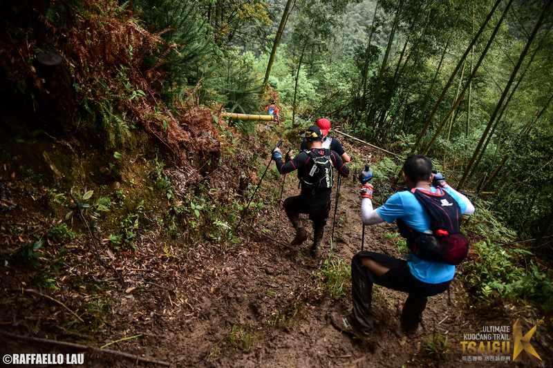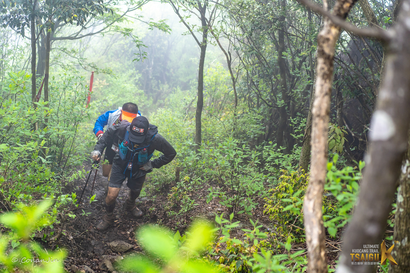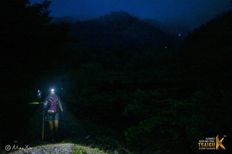 和去年一样,道场基之后的路都是一个人在走。晚上雨雾很大,迎面都是细雨蒙蒙,视线不是很好,还好没什么岔路,一直走就是了。全程快走,超过几个人,也被几个人超过。后面一段特别陡的下坡,我知道有一边是悬崖,所以特别小心。在这里被至少10个人超过。不应该啊。都是落到最后的选手,你们怎么这么优秀。他们也真够胆大的,下坡的时候很快,有一个人摔出悬崖半个身子,被同伴拉回来。