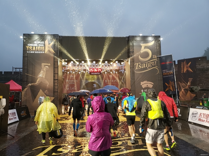 凌晨4点多,比闹钟先醒了,起来收拾准备好吃了点昨天买的面包牛奶就下楼,居然碰到群里大神Benny正好叫了车子,他又招呼了2个不认识的跑友上车,一起赶往兴善门广场出发地点。虽然天空下着小雨,但热情的我们丝毫不受影响,到了现场人太多,一转眼就找不到人,各自准备,雨确越来越大,大家到处找地方避雨,临近开赛20多分钟,我过去排队,看到大家都在拍照,我也找跑友拍了张出发照,只一会我后面就排的满满的,主持人在做着动员,激扬的音乐让现场的我们充满豪情,根本没有把头上的倾盆大雨当一回事,昨天入手的萨洛蒙冲锋衣正好派上了用场。有小伙伴留言,在线看直播给我们加油,提醒注意安全,一切都准备妥当,就等出发的号令了。