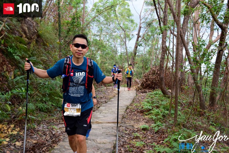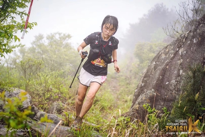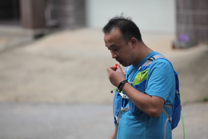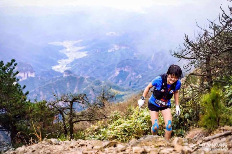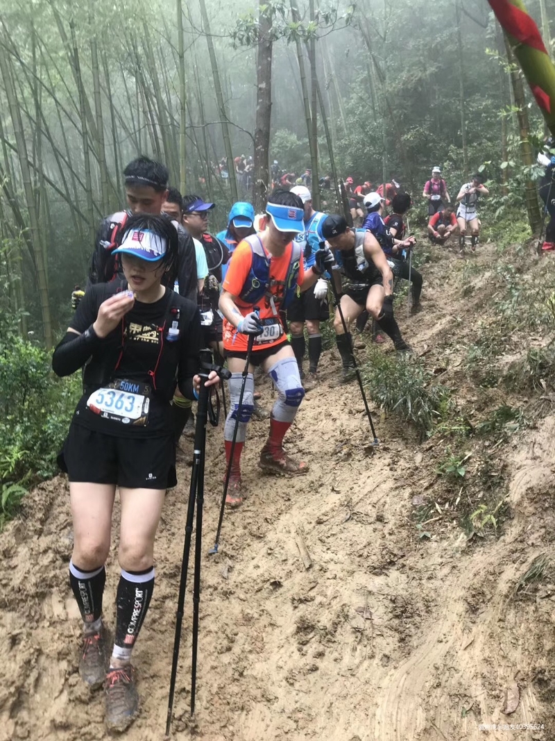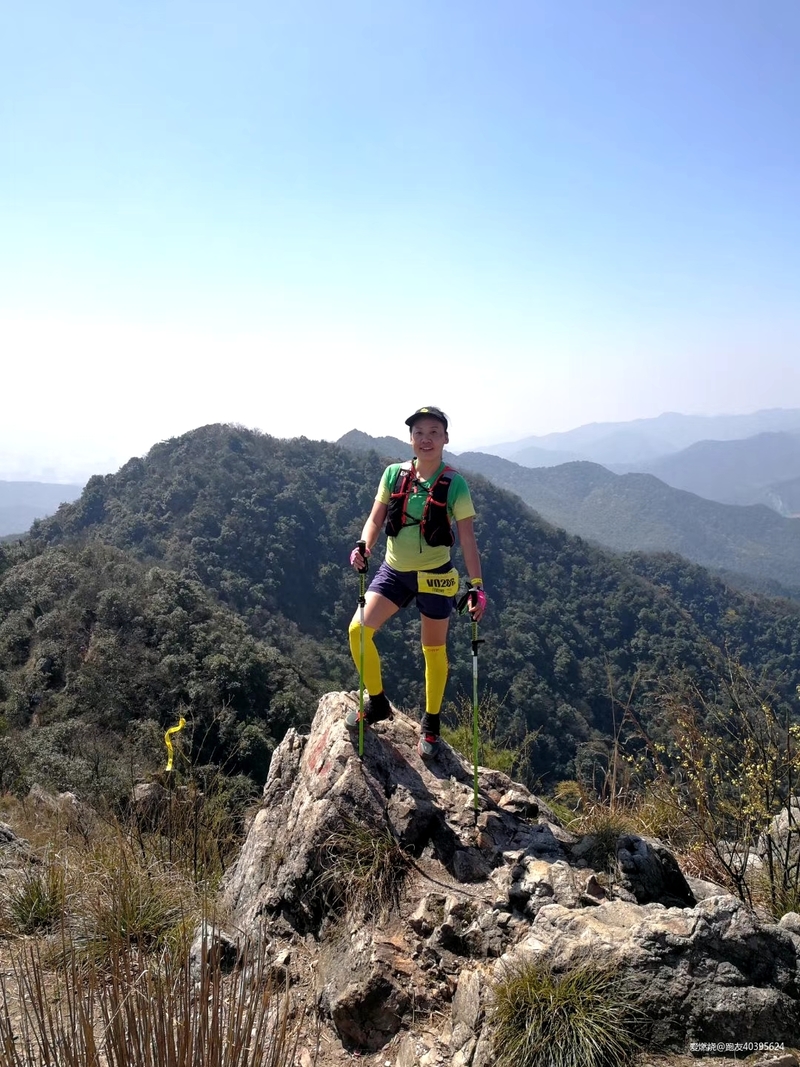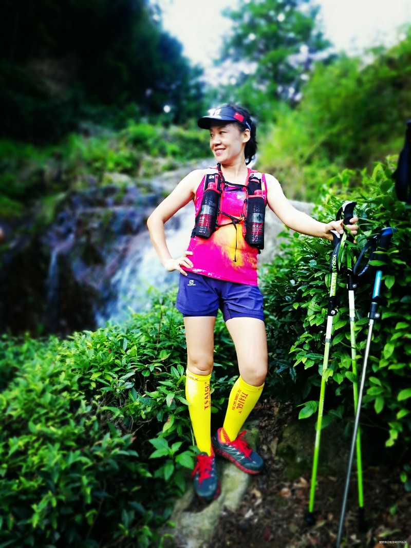 自己不敢跑,看着别人跑非常痛苦,差不多40公里的时候,一个美女从身边经过说,帅哥,你的杖尖要放前面,虽然身边有人的时候我很注意杖尖,但是人说的对,俺们得听从劝诫。这时听到旁边俩哥们聊天,哇,这美女腿长得真好看,我才想起好像认识,于是追上去几步聊了起来,果然是朋友圈的“菲小菲”,今天算见到女神的真面目了,她说我腿隐隐作痛就不能再跑了,应该是髂胫束的问题,再跑容易受伤,好吧,我已经不敢跑了,一会美女从我身边飘了过去,俩帅哥也飘走了,又剩我一个人。我就奇怪了,平时训练我也挺规律的啊,为什么一上山就容易出问题,群里女冠“艾琳”也练的不多,为什么她就可以百公里站台呢,女冠“艾琳”,杭州问道100女子冠军;东海大峡谷75公里女子冠军;大家都叫她艾琳姐,在我眼里却像邻家小妹,除了她洒脱的个性和永远充满阳光的笑脸,给我印象最深的是,跑友约去苏州跑山,她总是问:你们打算几点回?只要不耽误接孩子,我就去。。。看看,这边要从上海赶到苏州拉练,还要想着按时回来接孩子放学,多么让人泪目!我不由幻想,如果我是“西红柿首富”,我就要在上海造一座山,至少要300米。。。