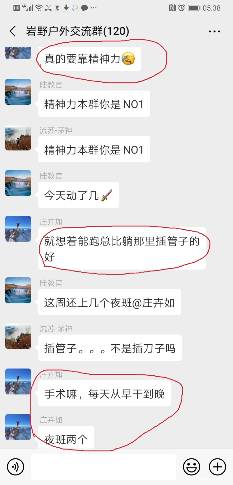 前面跑的挺顺利,30公里后膝盖隐隐作痛,于是放慢速度,确保不要出现意外受伤;习惯了一路跑一路幻想,这时想到了群里的精神领袖“小苹果”,又被称“女庄主”“苏州一姐”,名头这么多,可不是瞎盖的,国际越野跑协会积分ITRA高达614分,在国内女子中排名靠前,站台是家常便饭,关键是看看她的职业让人惊掉下巴:拿手术刀的,赛前还在经常熬夜做手术,可以想象一下,这样一个小姑娘,身体里是有多大的能量!大家看看聊天记录吧!经常有朋友问我,这么虐,还有危险性,为什么还要去玩,我之前的回答基本是:即磨炼精神毅力,又锻炼身体,还顺便游山玩水;现在庄医生的话说到了我心坎里,是啊,能跑就不希望躺在手术台上,做任人宰割的鱼腩,即使有这一天,也要让它来的晚一点!