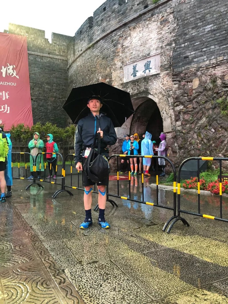 一夜无话,睁眼已经三点多了,上了趟厕所,发现雨越下越大,心里有点小不安,虽然之前也雨战桂林和神农架,但都是小雨。在床上又躺了会儿,无法再次入睡,索性就起床了。洗漱排空,戴好隐形眼镜,避免在风雨天光顾着擦眼镜,一旦摔倒也是一个安全隐患。这个天气,太阳镜完全就是累赘了,直接放弃掉。其他全都保留,只不过把号码带换成了nakeband,给挂手杖的方式多了一种选择。吃了两个提前准备好的蛋糕,喝了点水。一看表,该出发了。下楼一看,雨下得很大,带了把伞,到时候计划寄存。幸运的是,遇到了一位开车的选手,拉着我们几个一起去起点的选手到了临海兴善门。否则这一公里多,非把鞋子先湿透了不可。