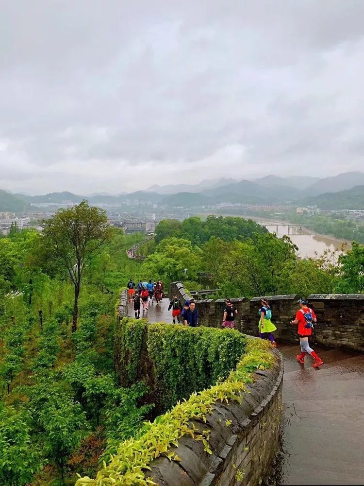 转眼到了城墙,爬升六七十的样子,按照自己的节奏上台阶,到了城墙上。台州古城墙保存完好,让我想起了西安的古城墙,但台州的更加蜿蜒富有韵味。在古长城中行进,下着中雨,脚下青石板很滑,在一个转角处略微滑了一小下。马上给自己提了个醒,主意脚下和身体姿态,注意安全。