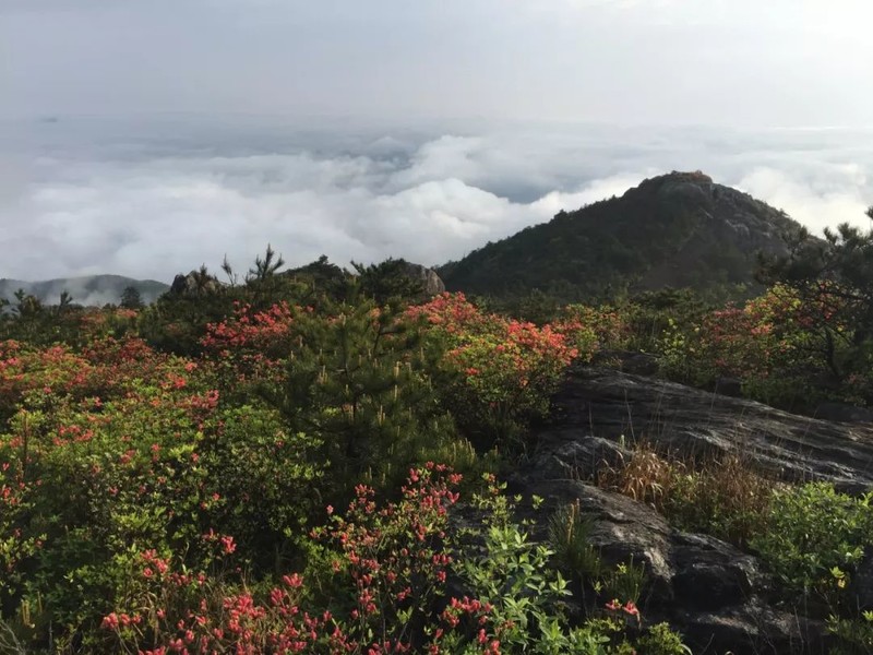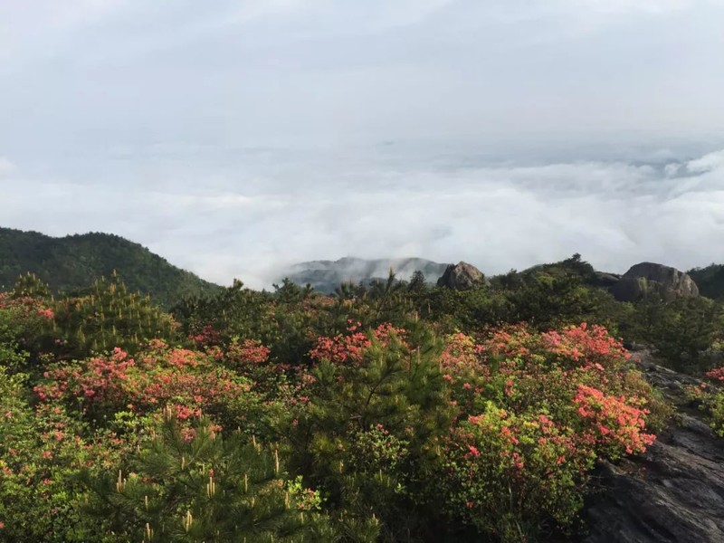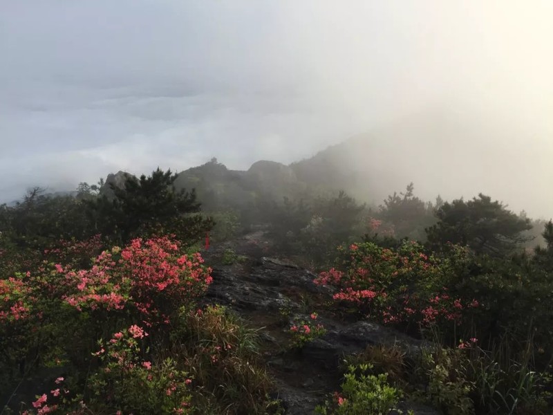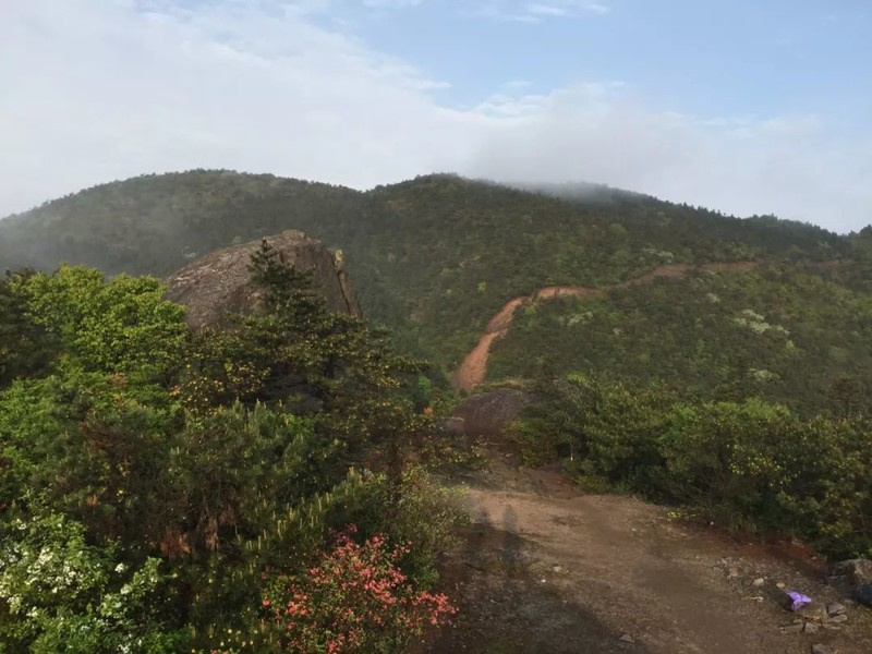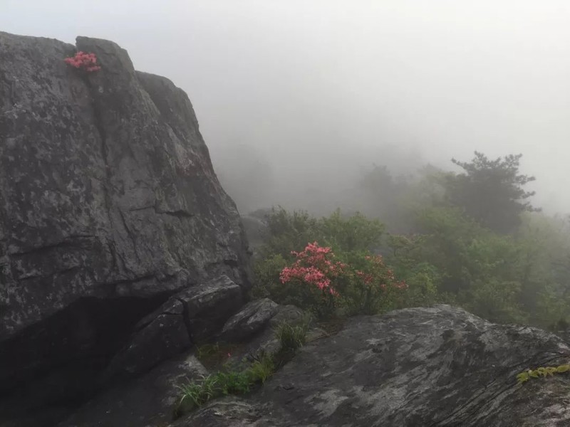 随着不断的上升,身边的植物也发生变化,我看到了美丽的火红色高山杜鹃(映山红),在雨水的冲刷下显得格外的鲜红靓丽。扭头看到山坳中的弥漫的雾气和山峦起伏,心情好了许多。
