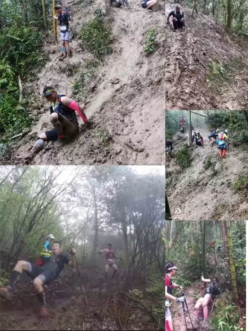 然而,我错了!全是烂泥,道路湿滑和陡峭和去年在神农架的烂泥坡相比毫不逊色。不经意之间,我已经滑了一个屁墩。但我依然没有放弃跑下去的执念,在一个明显危险的转角,我明已经察觉到了危险,却没有减速,直接冲了下去。结果脚下一滑,身体失去控制,摔出了赛道。在空中我稍微转了一下身体,也许是柔道的受身技还残留于体内吧。还算幸运,一堆灌木拖住了我的身体,我借着弹性忽地站起。顺便回答了下山下志愿者听到我声音后关切的问询,我说我还好,没事。