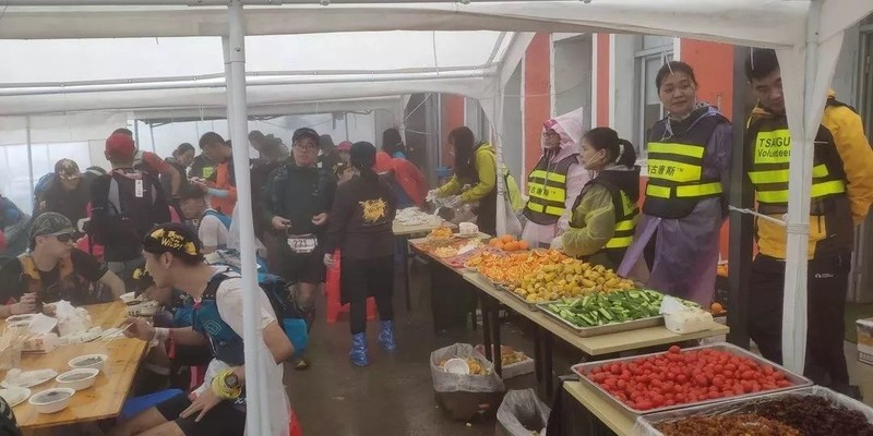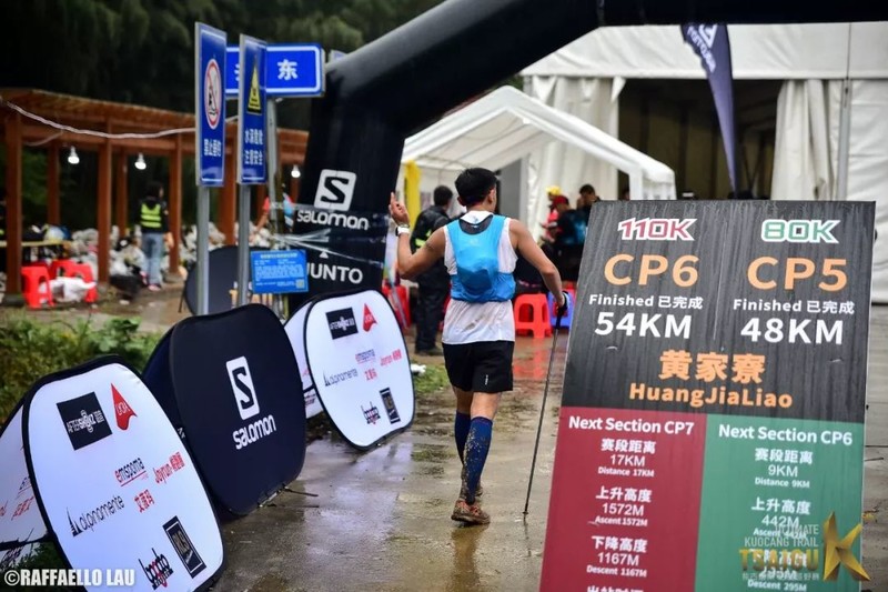差不多下午五点整,我到达了CP5黄家辽。黄家辽十分热闹,这里是110km组别的换装点,也是110km和80km两个组别的强制装备检查站点。大家都在排队进行强装检查,我亲眼见到检查没有通过直接被减掉手环退赛的,也见到手机电池余电不足,但没带充电宝的,被要求必须在站内充好后再走。