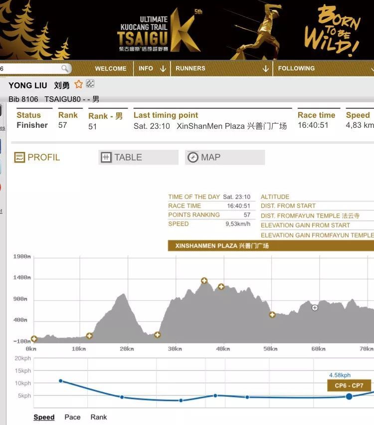 冲线,16小时40分51秒,84km,爬升4900,总排名58,男子51,获得组别前八十名的荣誉红马甲。