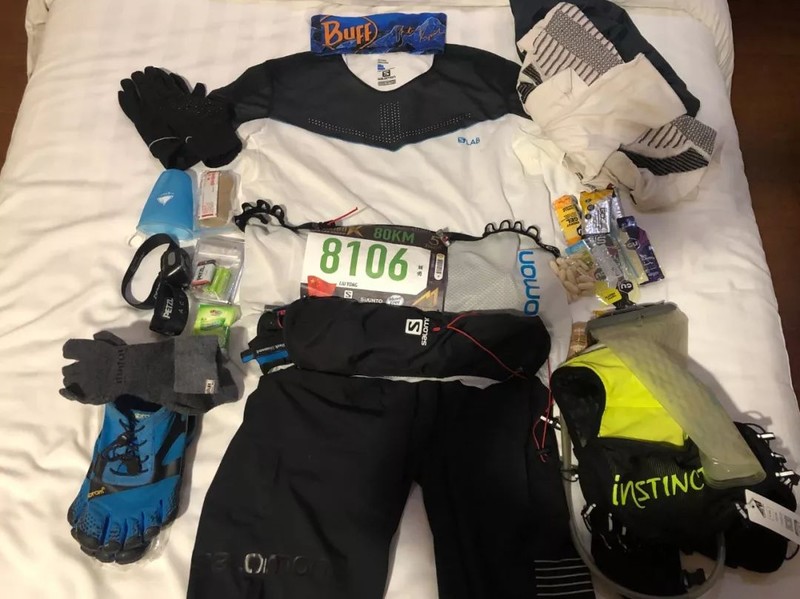 然后打车到酒店,入住后放好行李,就到知名的荣小馆吃饭,晚饭后马上回去整理装备,因为第二天六点半就起跑,需要四点多起床。把参赛装备准备了一下,拍了个定装照,一方面检查所有强制装备以防遗漏,一方面有一点仪式感。那个五指鞋是用来搞笑的,无论如何我也不敢在柴古用五指鞋跑80km。