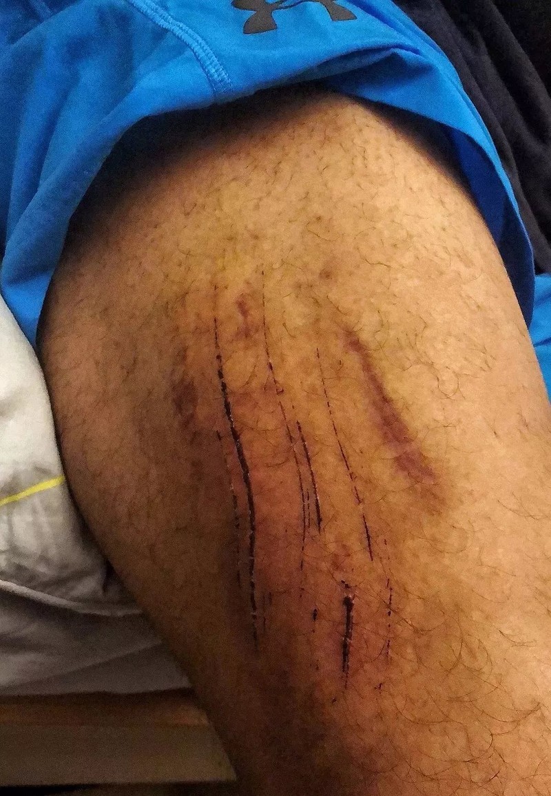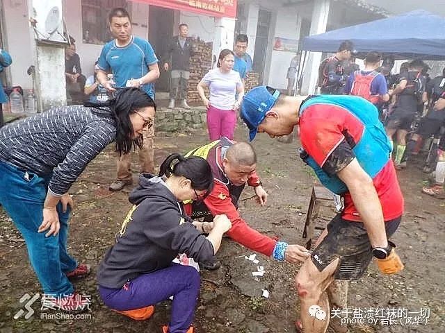 看马总走了,才转身去医疗站准备处理一下大腿两侧的伤口,刚刚一路跑过来,也并未觉得有什么大事儿。医护人员用碘伏棉签帮我擦拭伤口,清理了边上的污物,擦净之后发现,划痕数量不少,但都是浅表型的划伤,清理好创面继续上路。在心理暗暗提醒自己,一定要精神集中,绝对不能再出现这种情况了。