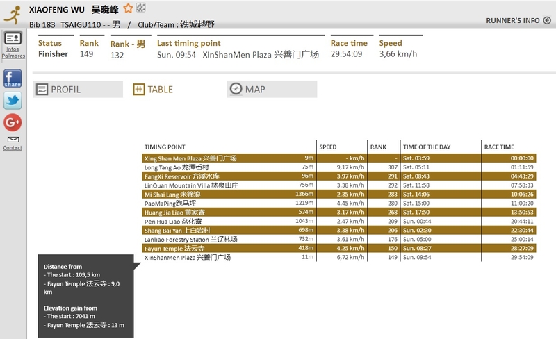 所有的这一切,预示着这场比赛注定是一场非常艰苦的比赛,然而我一步一步挺过来了,而且名次逐步上升。本次参加110公里组有557人,最终完赛214人,我从刚开始的307名,一直追到终点的第149名,我对自己的表现很满意。