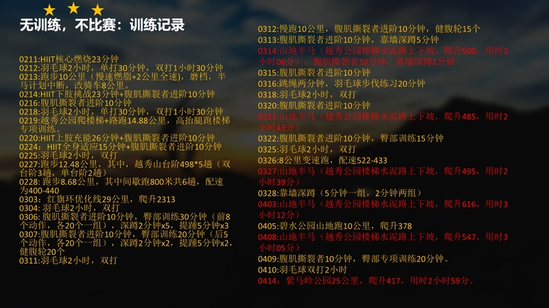 每周一次山地半马(持续跑楼梯和坡,每次耗时大概3小时)。