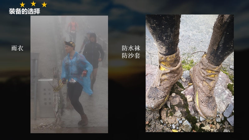防水袜:CP6之前我没有穿防水袜,连续泥泞作战,泥水都浸入我的袜子里层了,脱下袜子后都能看到黑黑的泥巴,CP6之后换上防水袜,一路干爽,没有出现很多选手那种跑完后脚底皱巴巴的情形。