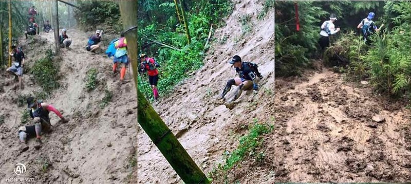 快乐的时光总是短暂的,换来的是后来的痛苦和长叹。在CP2贺家洞之前的一段下坡土路,道路被雨水浸透,加之前面几百名选手的踩踏过后,泥泞不堪,此处成了众多选手的天然屁降场。天王在赛前的路线报告中本来就明确提示了此路段雨后的难度为4+,为50KM最为困难的一段,但我们大多数人还是忽视了提示。此处各种人仰马翻,举步维艰,而且造成了严重塞车,更糟糕的是,由于地面太滑,在我回返了10多米找一个能站住的地方取杖的时候,小巫婆和我走散了。