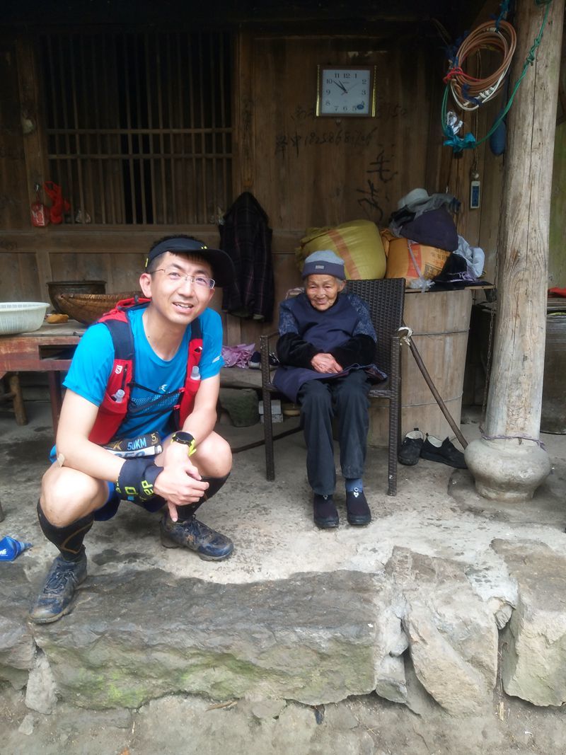 好不容易捱过这段魔鬼赛道,马上到了CP2,并没有见到小巫婆的身影,匆匆喝了点泡腾水继续向前追赶。爬升,心率在此段飚到了比赛期间的最高值,终于在爬升到大概一半,山上的老奶奶家追上了在此休息的小巫婆。奶奶80多岁了,今年依然给选手们准备了煮好的番薯和芋头,我没舍得吃,跟奶奶合了一张影就与小巫婆一起上路了。