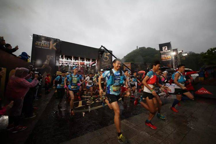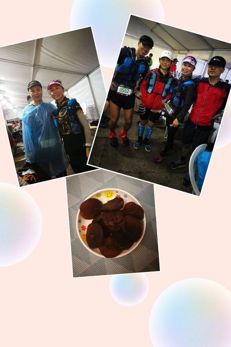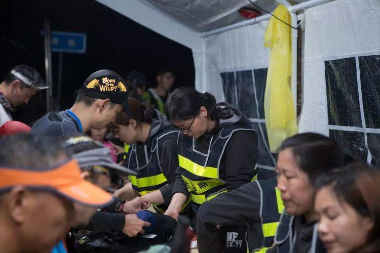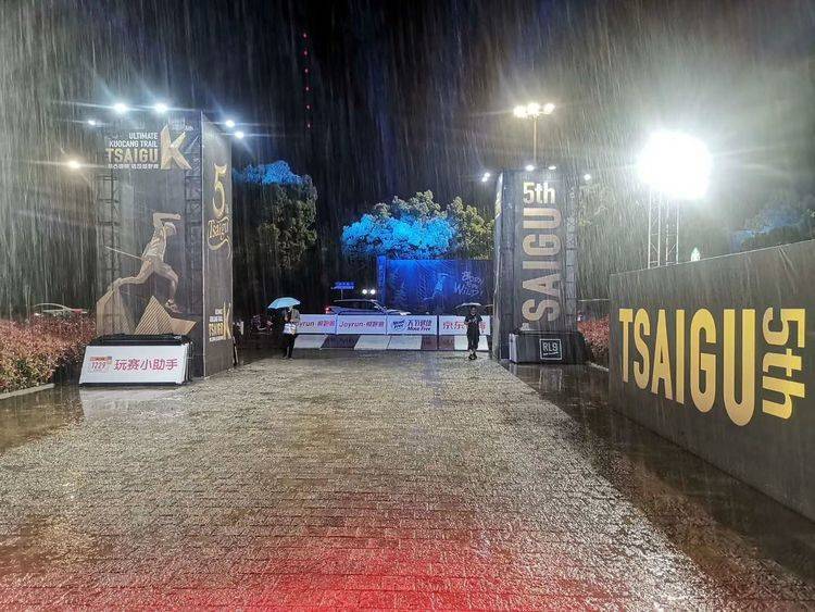 赛前很长一段时间,柴古5群关心的事两件:CP点有啥补给(被老板娘称为吃货群),比赛当日天气如何。而赛事最终没能逃过雨战!尽管通过天气预报对此早有准备,但到了比赛日,心里真的是很惶恐。夜里,不知从哪里的歌厅传出卡啦永远OK,扰得难以入睡。迷迷糊糊之中,闹钟响了:清晨2点钟,团长出战110K起床、整理装备、化妆、出发,团长的越野总是美美哒。她走后,我睡意全无。前一晚的腹泄,导致这会感觉非常的饿。找出包里仅有的面包三两口吞下,又消灭两条能量棒,胃总算有了点底。时间尚早,窗外的雨声很大,心里开始有些许的不安:这样的天气,能完赛吗?这样的天气,老伤会不会有影响?这样的天气,会不会被完赛……越想越多,心里越没底。索性拿出肌效贴,将受过伤的左脚踝仔细的固定好;想想,又把双腿的膝关节、腘绳肌、髂胫束都固定上,一双腿被贴得乱七八糟,惨不忍赌。拿出装备,开始认真穿戴。除了柴古黑金参赛T(太好看了),其它装备均与港百无两,希望港百的幸运能得以延续。到宾馆前台取了早餐,全部吃完才觉得有了些许力气。于是与帅哥宇一起打车前往起点。