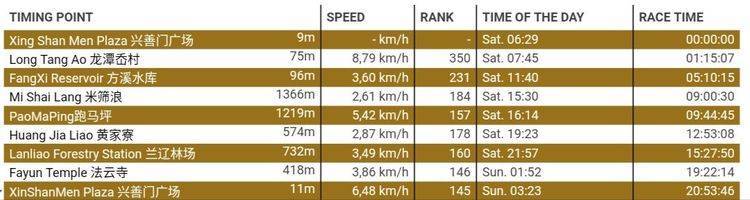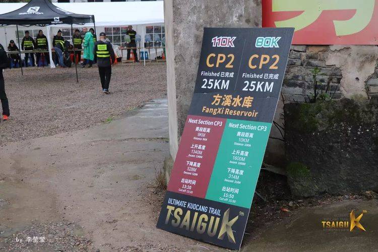 从山上下来,沿着缓缓爬升的碎石机耕路,向CP2狂奔。远远看到CP2的指示牌,深吸了一口气,依志愿者的引导,向站内走去。进站迎面遇到了美女旭,她见到我惊道:“我被你追尾了啊!”当时不解她什么意思,后来看到赛事照片才明白,原来起跑时她站在精英选手后面,率先起跑。帮她拍了美美的照片,开始寻找可口的食物,补充水和运动饮料。先到的选手有的席地而坐,有的靠在墙边休息,有的站着大口大口的咀嚼补给。我知道,我必须多吃,对于我这种爱饿体质的人来说,下面赛段要命的1600+爬升,如果碳水、能量不够出现低血糖,那真是会要命的。补充完能量,我迅速向站外跑去,出站打卡累计用时5小时10分,距离关门时间仅提前10分钟。