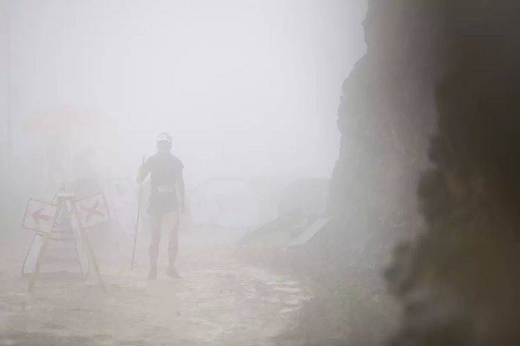 雾很重夹杂着小雨,500流明的头灯在这样天气里的可视距离很短,连脚下的路都看不清,更别说远处。路上没有前半程厚厚的泥,但因地面上的泥水增多、可视度不好,没有什么难度的路面,也很难跑得起来。宽点的路,走靠山体的一侧,尽管石子多还要注意不能扭脚,但总比一直泡在泥水里的感觉要好;窄点的路,就很小心的一步步挪过去,因为另一侧就是沟壑。被泥水长时间浸泡的脚底开始痛疼,针刺的感觉,每每落地都不自觉地收缩一下。慢慢的,左脚踝的老伤也有了痛感。到此时,安全是最大的心愿,能安全完赛是最好的结局。
