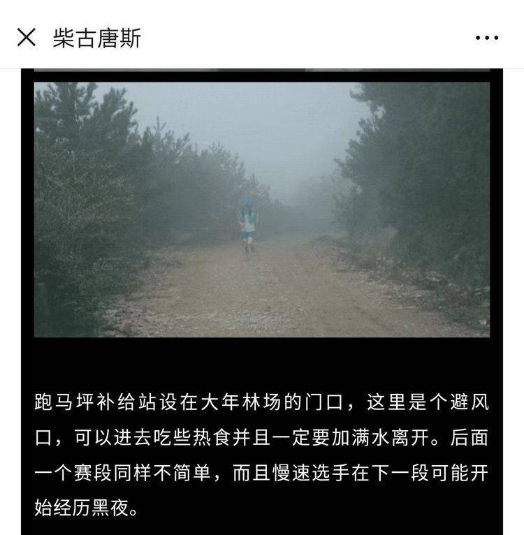 吃饱喝足离开米筛浪,虽然雾气更重,但觉浑身都充满了能量。一是真的吃了很多很多,柴古的补给真的很给力,二是后面的赛道相对要简单,心里不再有被关门的压力。这一段路,下坡跑得痛快,上坡爬得欢畅,轻轻松松就到了CP4大年林场。胃里食物没有完全消化,水袋里的水也都还算满,于是决定越过补给,直接出站。因跑得太顺,忘记了天王在赛道解析时的忠告:在跑马坪一定要注意做好补给,要吃好