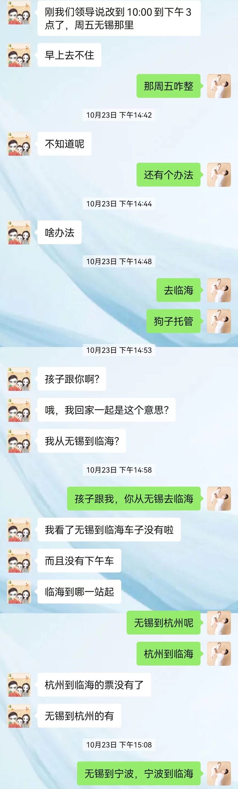 我提前订好周五早上去临海的高铁票,老婆公司临时安排她周五早上去无锡出差。