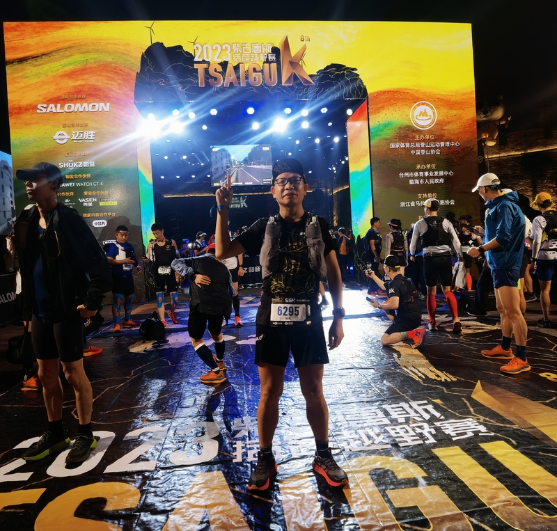 6点左右我站到了2023柴古唐斯括苍越野赛的起点。此时出发拱门处人头攒动,灯光在晨雾的映衬下绚烂多姿,大屏幕上播放着前两个组别比赛的画面,代入感极强。