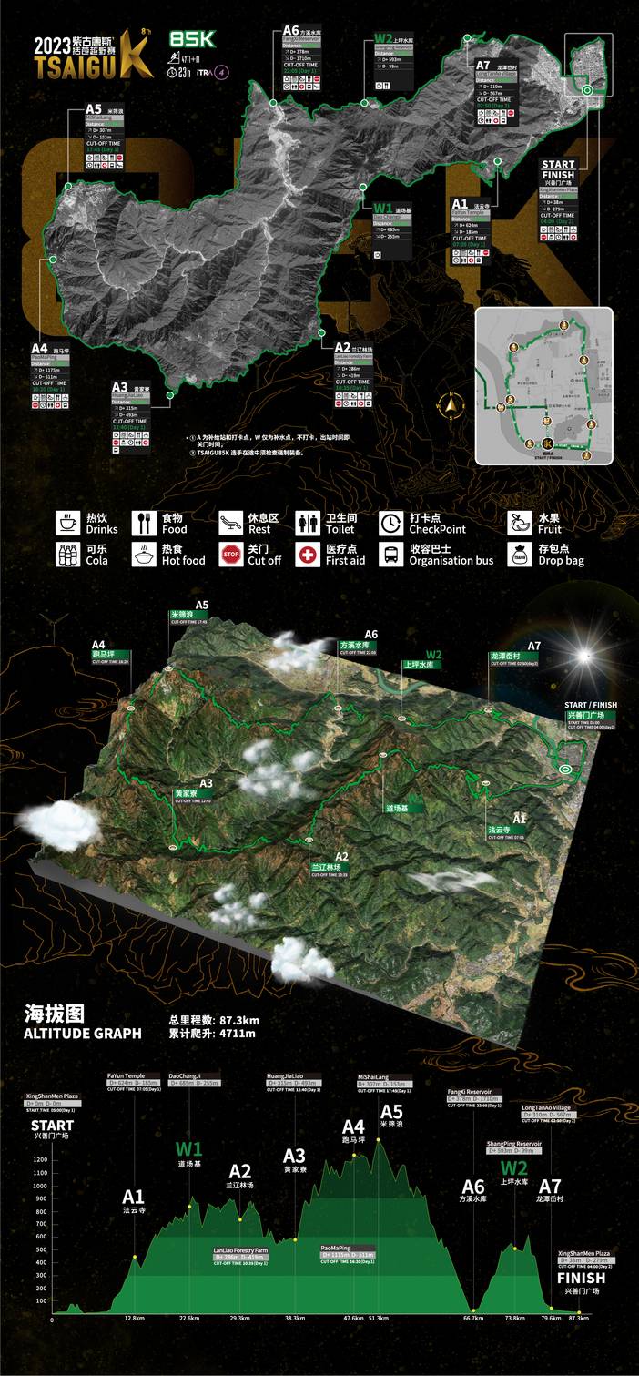 备注:A为补给站和打卡点,W仅为补水点,不打卡,出站时间即关门时间。起点兴善门广场-A1法云寺   12.8KM D+624  D-185  临海市区江南古长城脚下的兴善门广场,TSAIGU85在此起跑出发,,起点将使用计时地毯,...