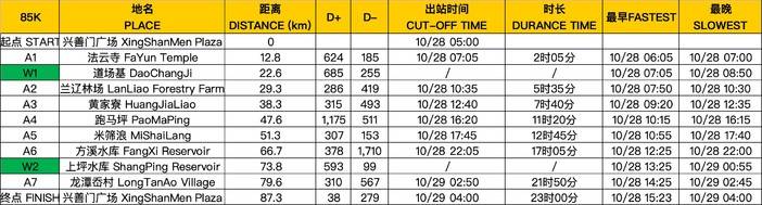 备注:A为补给站和打卡点,W仅为补水点,不打卡,出站时间即关门时间。